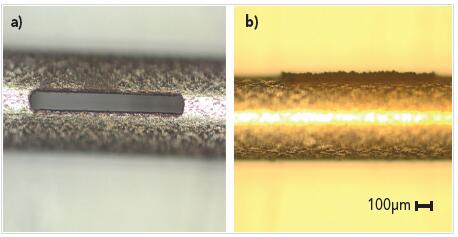 圖1:用飛秒激光器在不銹鋼樣品(a)上加工槽口。不需要進行后續加工,因為熱影響區域(HAZ)幾乎可以忽略不計。用納秒激光器加工的樣本(b)會出現較大的模糊區域,需要進行額外的加工。